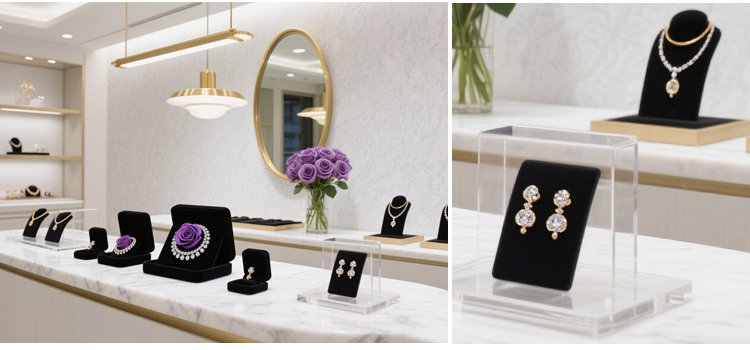 مجموعة قلادة راقية رصينة وغير متفاخرة مزينة بدلاية بديعة على شكل ورد بنفسجي وأقراط فاخرة وجذابة